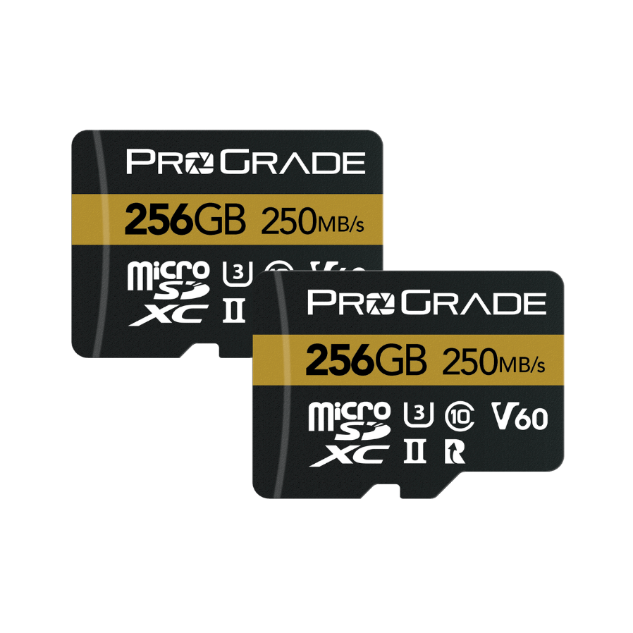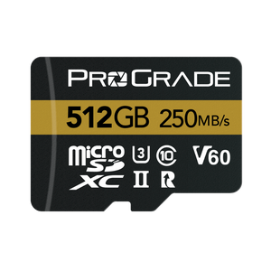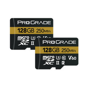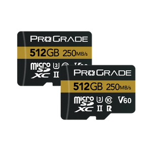 ProGrade Digital developed microSDXC, UHS-II memory cards for use in popular aerial and action cameras. Our microSDXC Cards are tested like a full-size SD card and can be used in DSLR and mirrorless devices. They also provide UHS-I DDR-104 and U3 speed class ratings which ensures maximum compatibility in all applications from single-shot stills to high-resolution 4K videos. Memory card capacities range from 128GB to 512GB and performance levels provide read data transfer speeds up-to 250MB/second - ideal for quickly off-loading lots of content from the card to the workstation.